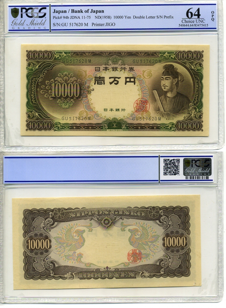 Япония 10000 йен 1958 в слабе PCGS 64 Choice UNC Pick 54b бумага UNC (пресс) 452-1-11