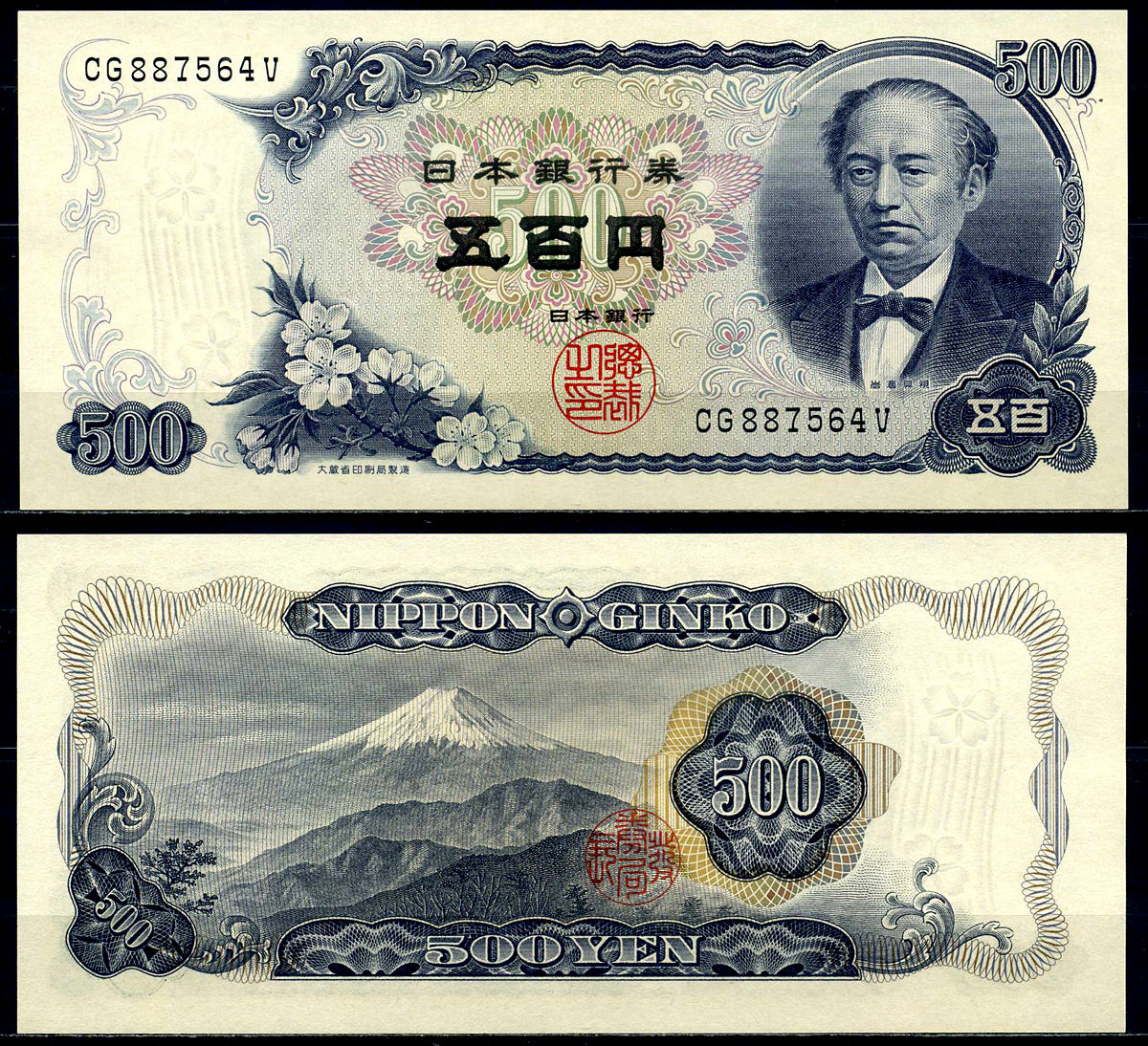 Япония 500 йен 1969 две буквы в серии Pick 95b бумага UNC (пресс) 446-135-1