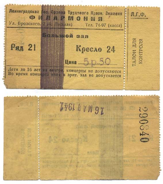 БИЛЕТ В БОЛЬШОЙ ЗАЛ ЛЕНИНГРАДСКОЙ ФИЛАРМОНИИ С КОНТРОЛЬНЫМ ТАЛОНОМ 16 МАЯ 1941 бумага 436-7-3-2
