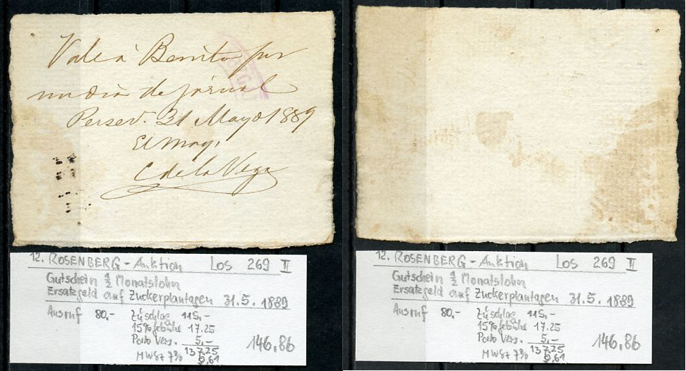 ---Куба 1 трудодень 1889 расписка за 1 день работы на сахарных плантациях, 31 мая 1889, с владельческой биркой бумага 451-570-3НовинкиАнтичность и раннее СредневековьеМонеты - ГерманияМонеты - ЕвропаМонеты - Австралия и ОкеанияМонеты - АзияМонеты - АмерикаМонеты - АфрикаМонеты - Россия, СССР, страны СНГ и БалтииБанкнотыАксессуары, ЛитератураОткрытки, карточкиАкции, облигацииЖетоны, Медали, ЗнакиМаркиКартины, декоративно-прикладное искусство