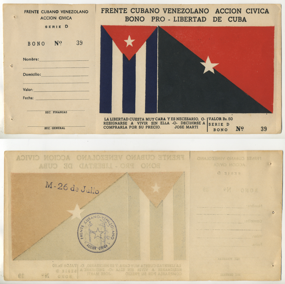 Куба корешок листа чековой книжки 1950 СЕРИЯ D, НОМЕР 39, С ОТРЫВНЫМ КОРЕШКОМ, НЕ ЗАПОЛНЕНЫЙ, СБОР СРЕДСТВ ДЛЯ РЕВОЛЮЦИИ В ВЕНЕСУЭЛЕ бумага аUNC 505-1-1