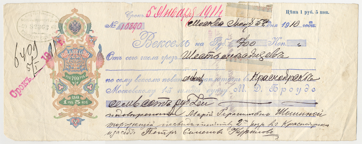 --РОССИЯ ВЕКСЕЛЬ НА 700 РУБЛЕЙ 1911 НА ИМЯ КУПЦА 1-Й ГИЛЬДИИ МЕНДЕЛЯ БРОУДЕ, МОСКВА бумага 505-7НовинкиАнтичность и раннее СредневековьеМонеты - ГерманияМонеты - ЕвропаМонеты - Австралия и ОкеанияМонеты - АзияМонеты - АмерикаМонеты - АфрикаМонеты - Россия, СССР, страны СНГ и БалтииБанкнотыАксессуары, ЛитератураОткрытки, карточкиАкции, облигацииЖетоны, Медали, ЗнакиМаркиКартины, декоративно-прикладное искусство