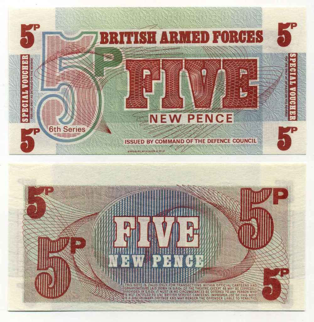 АНГЛИЯ 5 ПЕНСОВ 1972 ДЛЯ ВООРУЖЕННЫХ СИЛ, 6 СЕРИЯ, BRADBURY WILKJSON @ Co Pick М44 бумага UNC (ПРЕСС) 8589-46-1-2