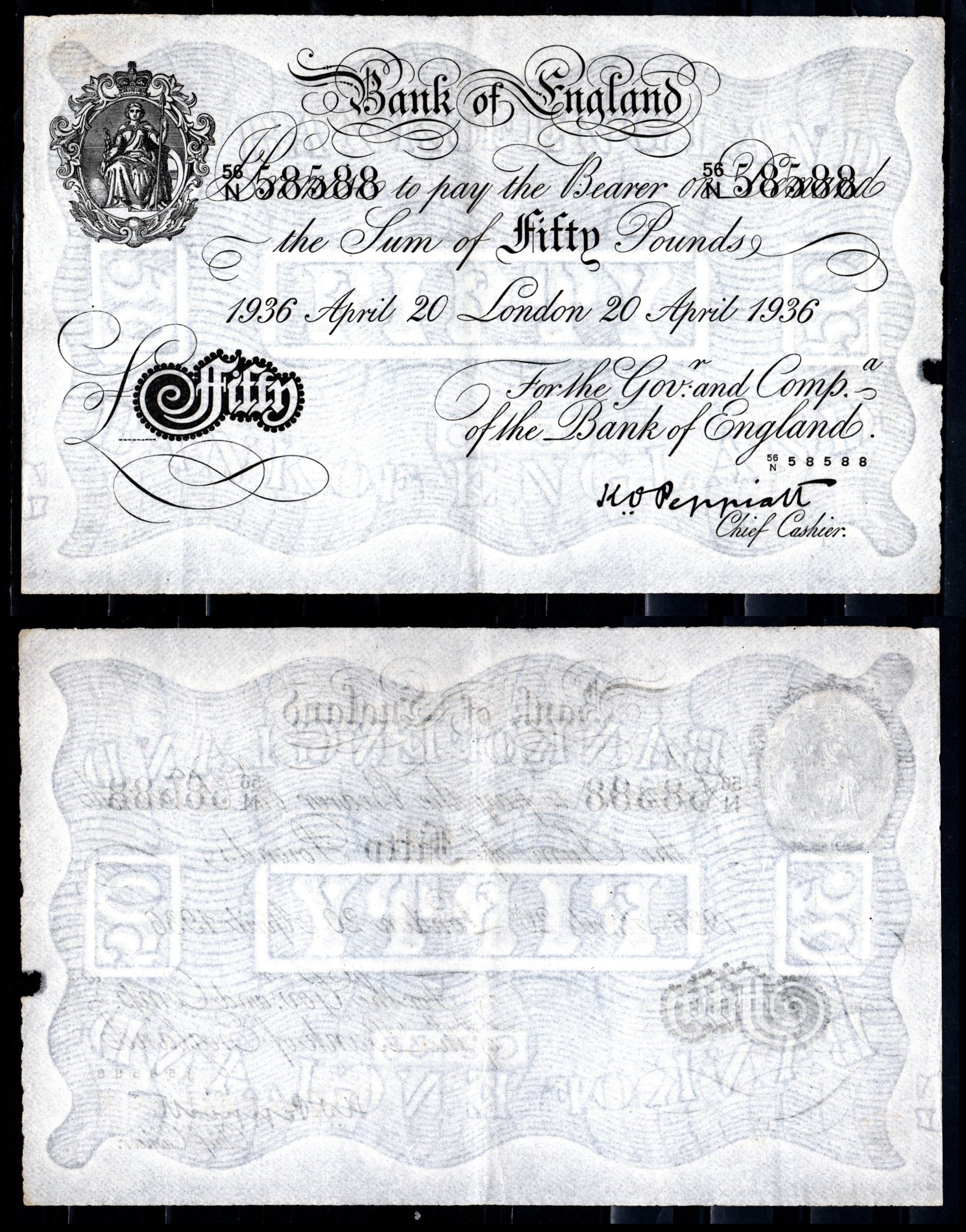 Англия 50 фунтов 1936 Лондон, 20 апреля, Операция "Бернхард", фальшивка в ущерб денежному обращению Pick 338 бумага 451-1264-1
