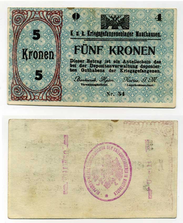 Австрия 5 крон 1916 Маутхаузен, лагерь военнопленных C-1419 бумага XF 504-17-3-1