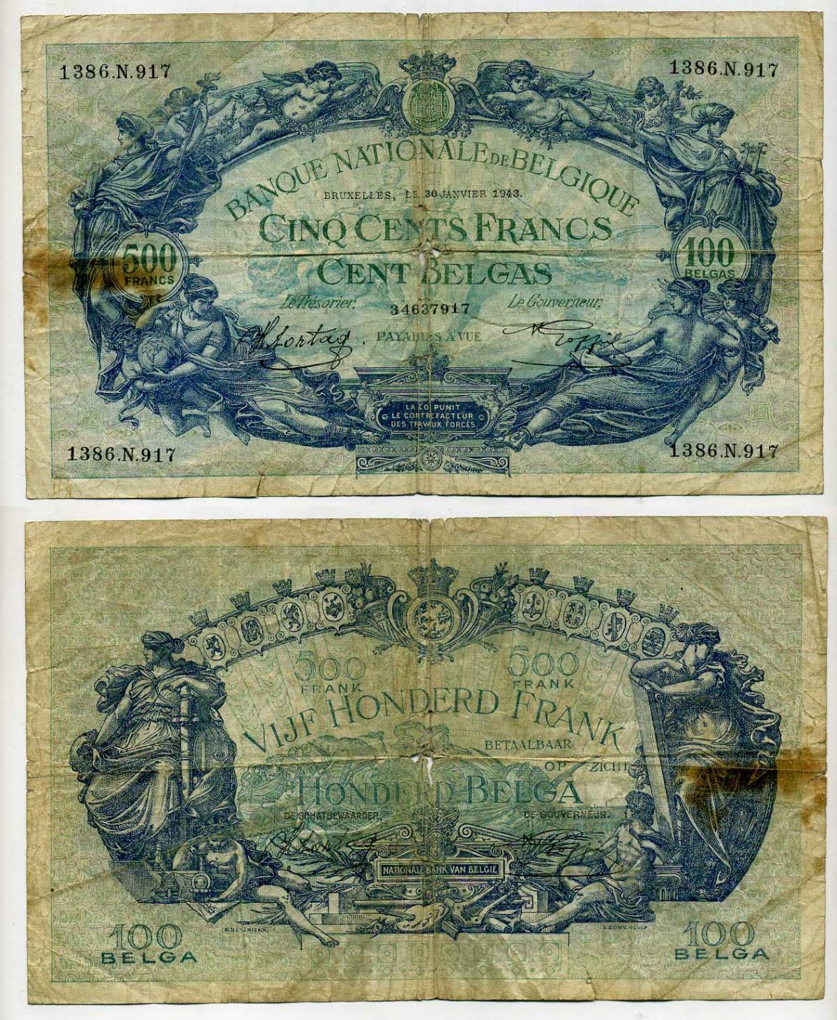 БЕЛЬГИЯ 500 ФРАНКОВ = 100 БЕЛЬГАС 1943 Pick 109 бумага 6289-22-1