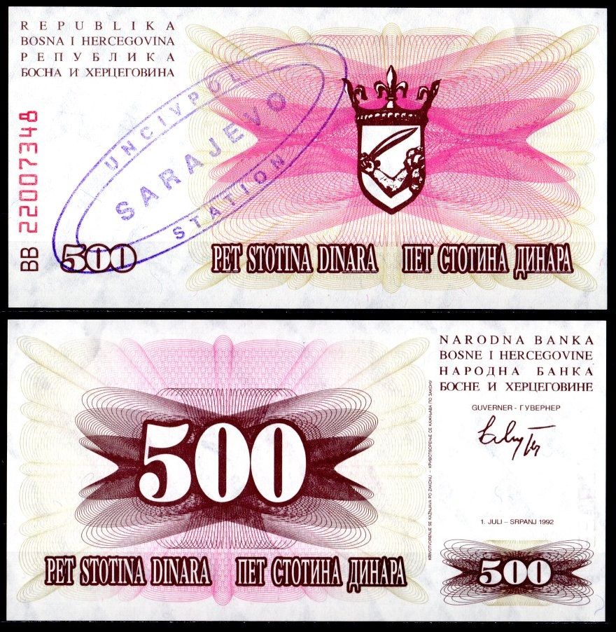 Босния и Герцеговина 500 динар 1992 Надпечатка UNCIVPOL-Гражданская полиция ООН в Сараево Pick 15 бумага UNC (пресс) 2119-31-3-1