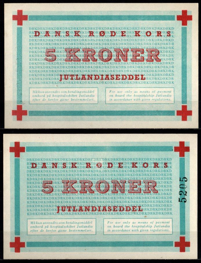 Дания 5 крон 1952 Для использования только в качестве платежного средства на борту госпитального судна «Ютландия» (Красный крест) бумага UNC (пресс) 8603-27-1-2