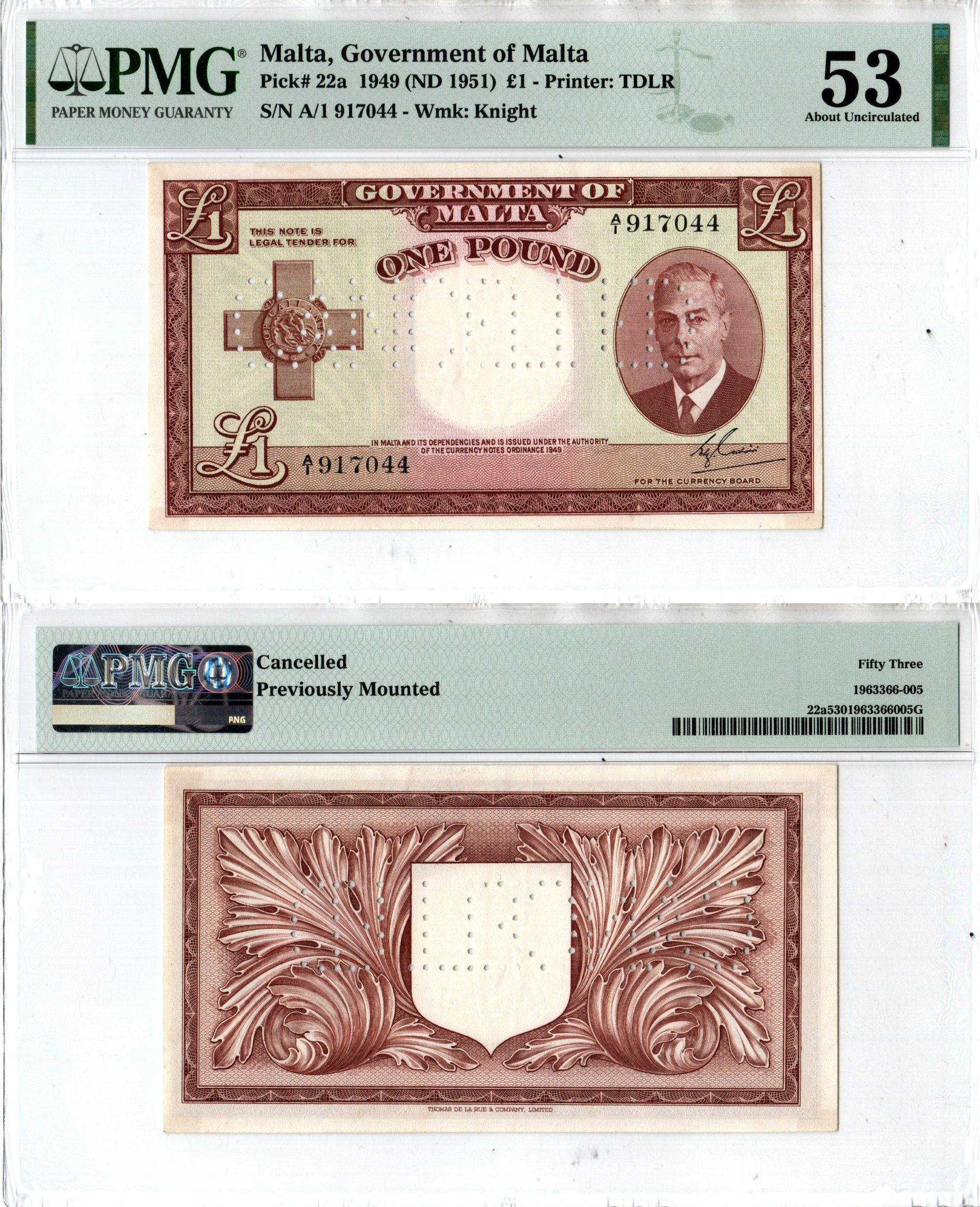 -----Мальта 1 фунт 1949 (1951) в слабе компании PMG. Сохранность - 53, перфорация "CANCELLED" Pick 22 a бумага 452-3-40