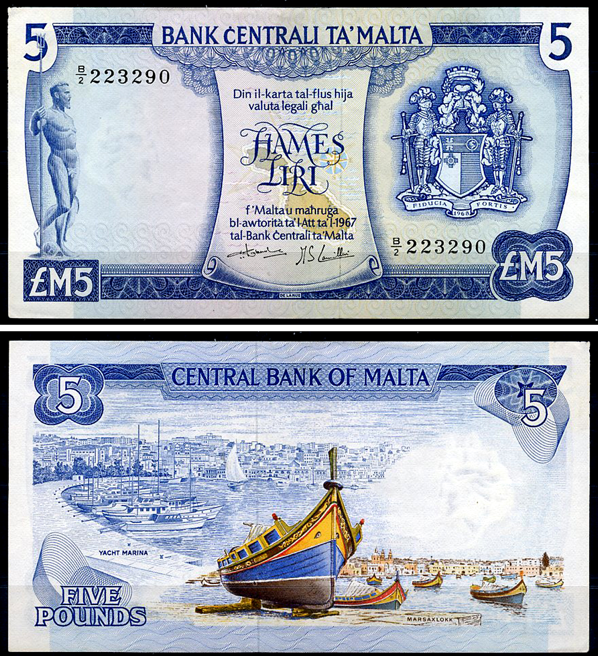 -----Мальта 5 лир L. 1967 (1973) карта, яхта, порт Марсашлокк, H. de Gabriele & A. Camilleri Pick 32 b бумага 451-1242-1