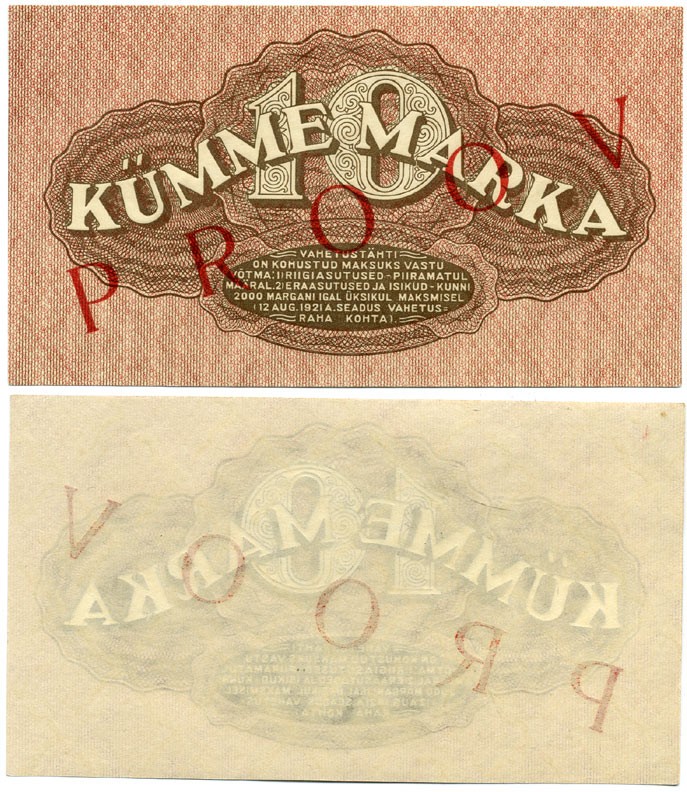 Эстония 10 марок 1922 красная диагональная надпечатка, PROOV, проба, SPECIMEN, односторонняя печать Pick 53s бумага aUNC 451-688-1