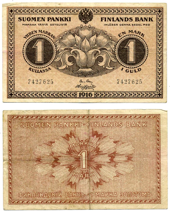 ВЕЛИКОЕ КНЯЖЕСТВО ФИНЛЯНДСКОЕ 1 МАРКА ЗОЛОТОМ 1916 СЕМИЗНАЧНЫЙ НОМЕР Pick 19, Кардаков К15.1. бумага 437-9-4-1