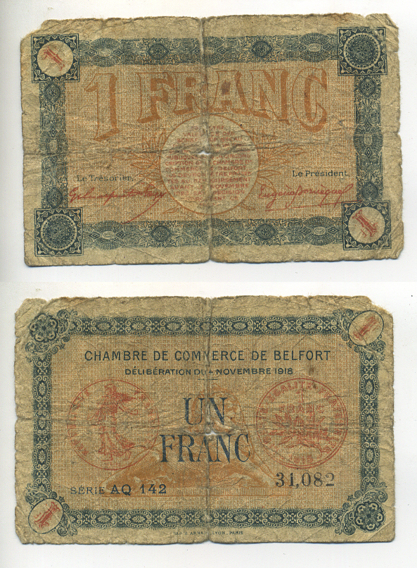 ФРАНЦИЯ 1 ФРАНК 1915 КОМЕРЧЕСКАЯ ПАЛАТА БЕЛФОРТА, НОТГЕЛЬД, ДЕЙСТВИТЕЛЕН ДО 1 НОЯБРЯ 1918 бумага 7552-31-1-1