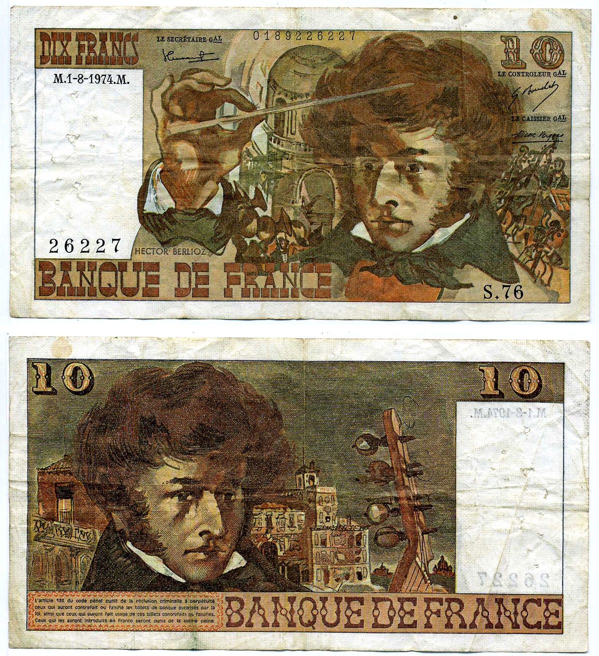 ФРАНЦИЯ 10 ФРАНКОВ 1974 1 АВГУСТА 1974, ГЕКТОР БЕРЛИОЗ Pick 150а бумага 7207-43-1-2