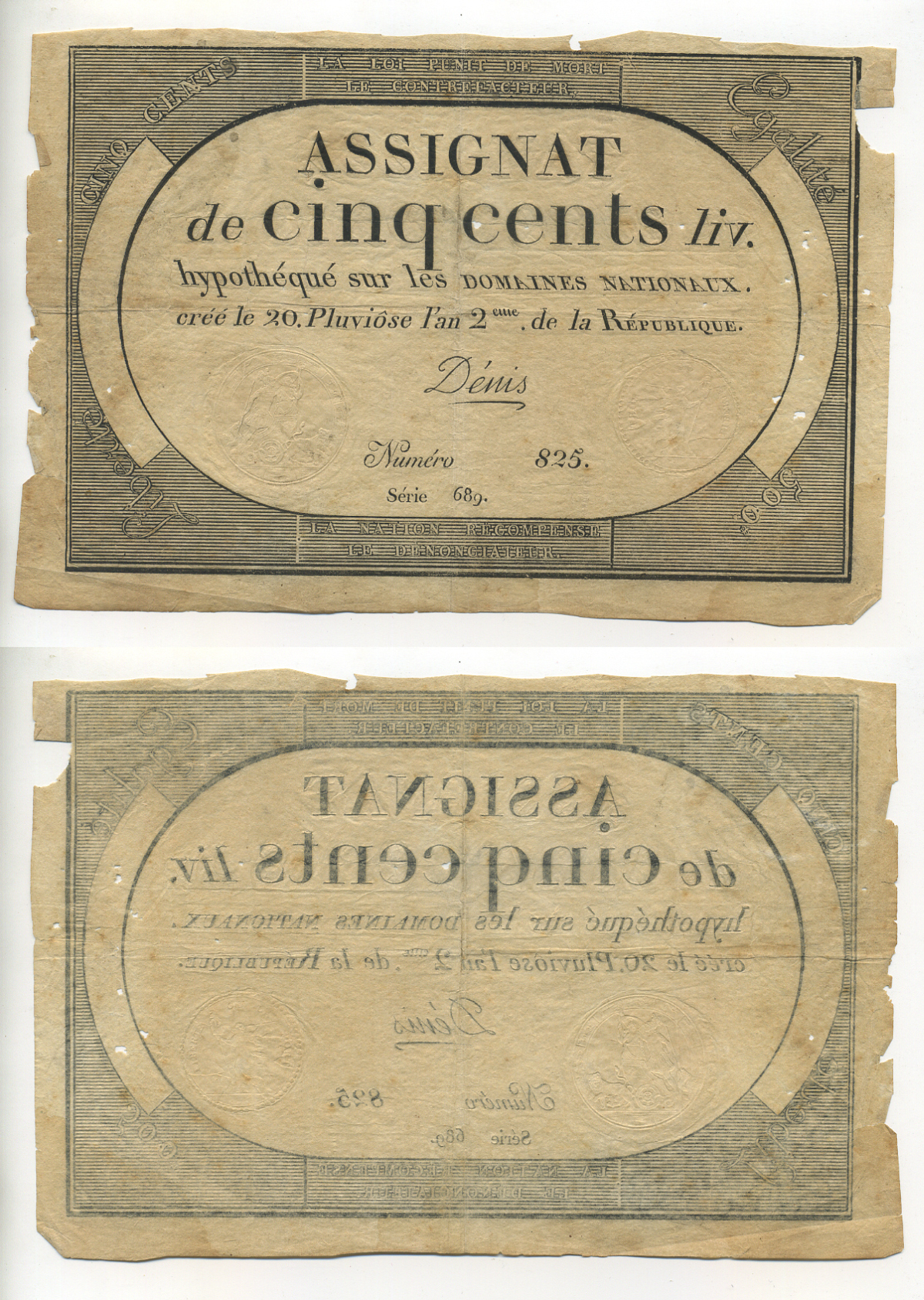 ФРАНЦИЯ 500 ЛИВРОВ 1794 20 Pluviose An II (8.2.1794), ТОНКАЯ БУМАГА Pick А77 бумага 7552-23-1