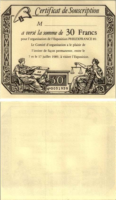 -----ФРАНЦИЯ ПОДПИСНОЙ СЕРТИФИКАТ НА 30 ФРАНКОВ 1989 ДЛЯ ОРГАНИЗАЦИИ МЕЖДУНАРОДНОЙ ФИЛАТЕЛИСТИЧЕСКОЙ ВЫСТАВКИ PHILEXFRANCE 89 В ПАРИЖЕ, ОТКРЫТОЙ ДЛЯ ПОСЕТИТЕЛЕЙ С 7 ПО 17 ИЮЛЯ 1989 ГОДА бумага UNC (ПРЕСС) 8607-97-2