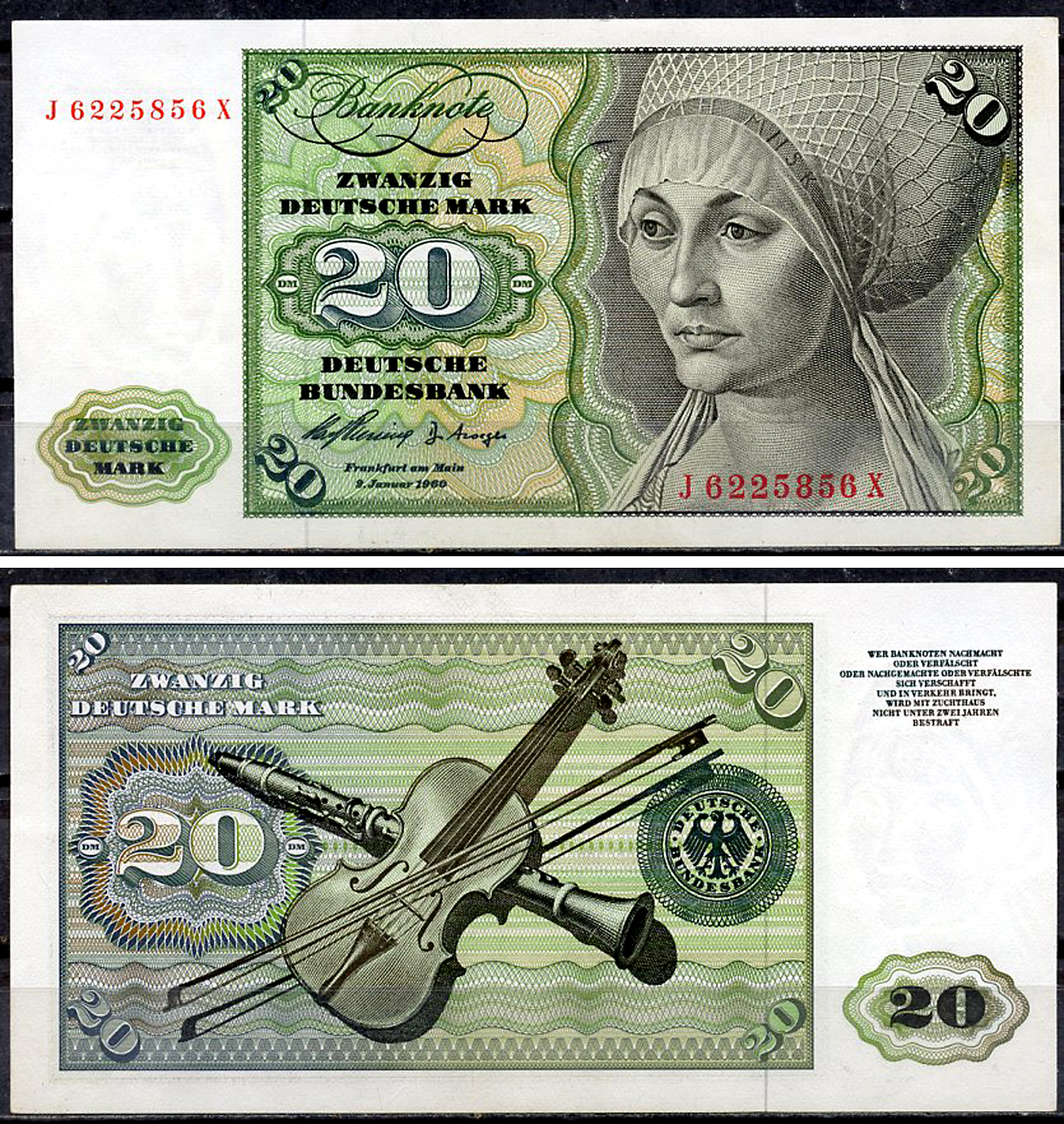 ФРГ 20 марок 1960 Эльсбет Тухер (Альбрехт Дюрер), скрипка, кларнет Pick 20 a бумага aUNC 451-916-2