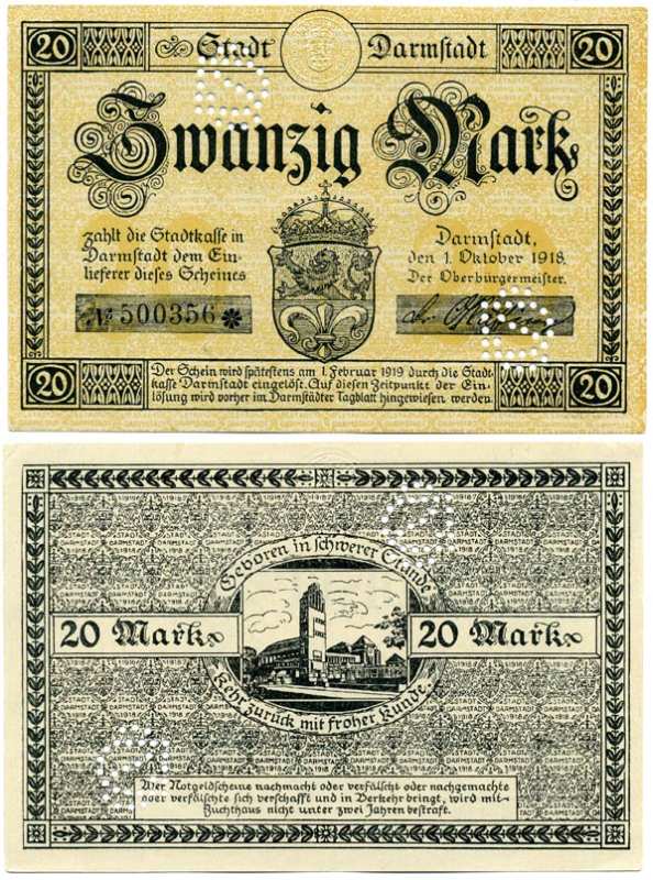 Германия, Дармштадт 20 марок 1918 - 1919 1 октября 1918 - 1 Февраля 1919, нотгельд, земля Гессен, водяной знак KREUZ-RINGEL-MUSTER, № номер снежинка, с перфорацией Geiger 092.07а бумага аUNC 8613-34-1-1