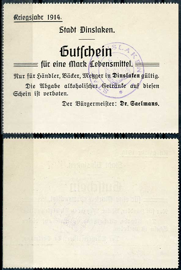 Германия, Динслакен 1 марка 1914 нотгельд Diessner 83.1.c бумага UNC (пресс) 444-98-2-1