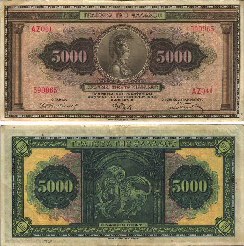 -----Греция 5000 драхм 1932 Афина в доспехах, мифическое животное Pick 103 а бумага 7191-42-2-1
