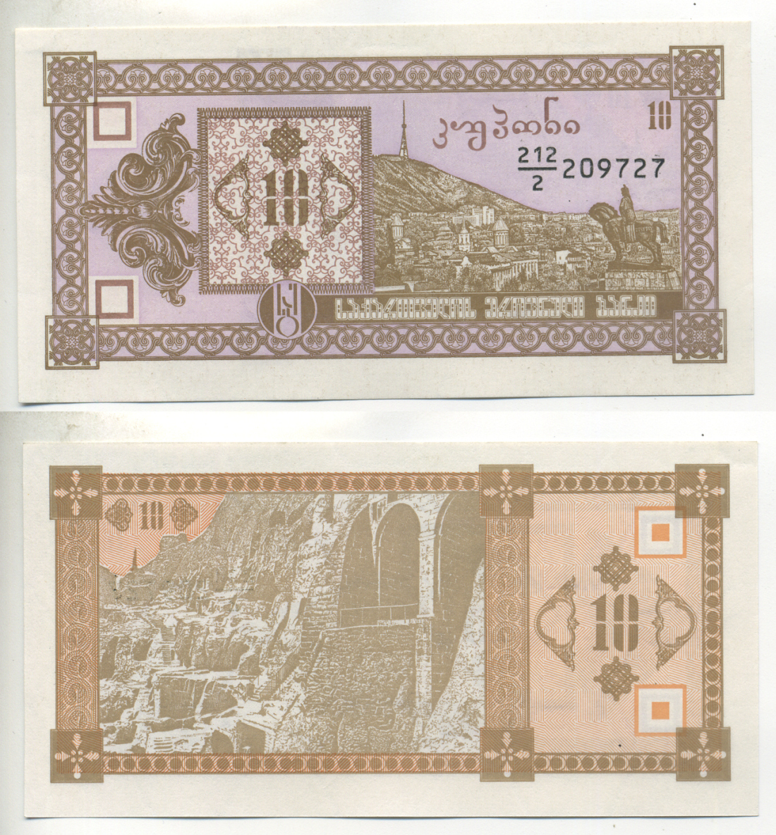 ГРУЗИЯ 10 КУПОНОВ 1992 ВТОРОЙ ВЫПУСК, В ДЕЛИТЕЛЕ 2 Pick 36, Сергеев 8 бумага UNC (ПРЕСС) 6293-56-1-1