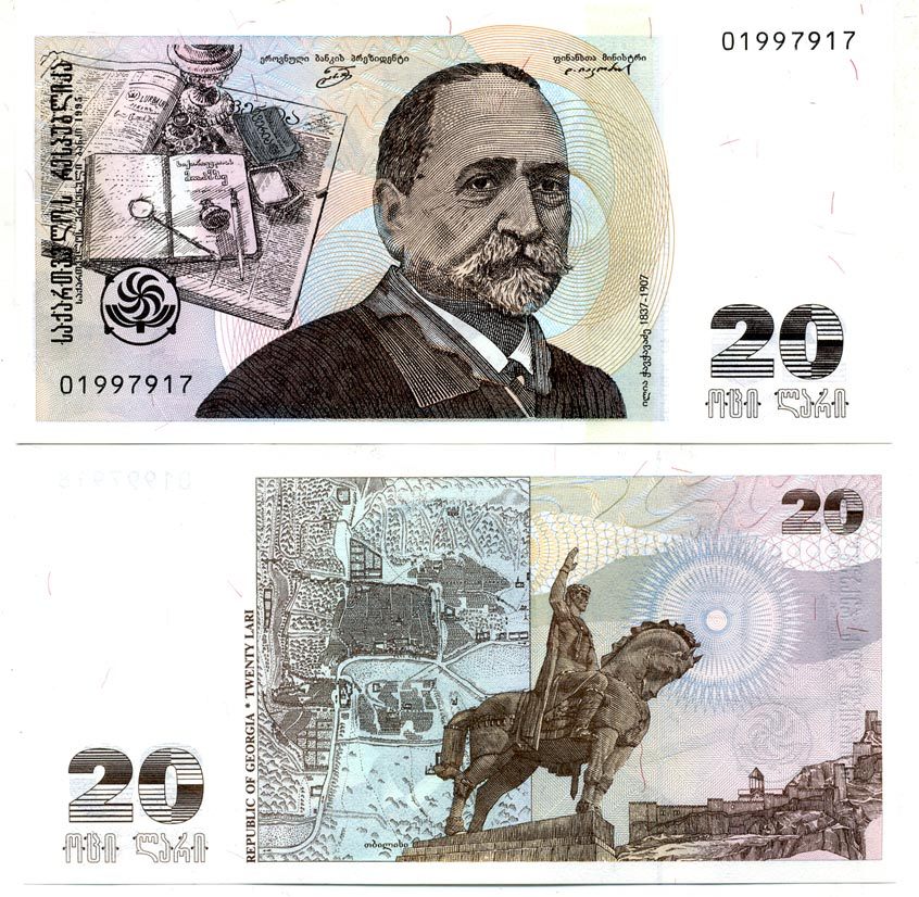 -----Грузия 20 лари 1995 Илья Чавчавадзе, памятник Вахтангу I Горгасали Pick 57, Сергеев 35 бумага UNC (пресс) 450-95-2