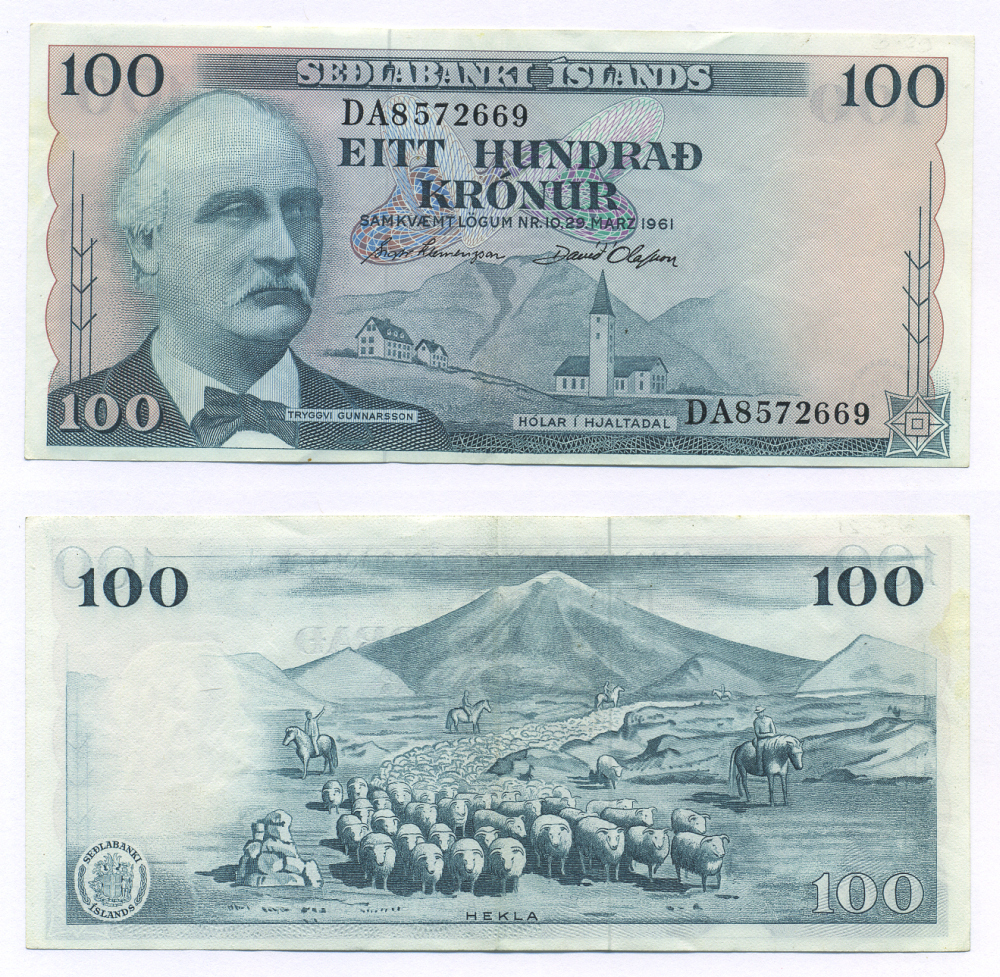 Исландия 100 крон 1961 подпись 39, Триггви Гуннарссон, вулкан Гекла Pick 44 a (8) бумага 7222-42-1