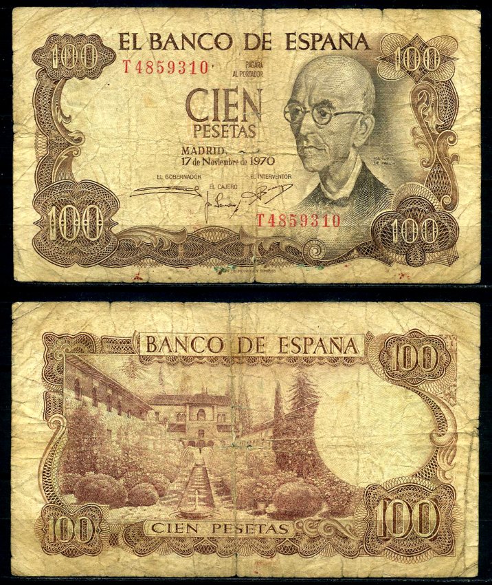 Испания 100 песет 1970 17 ноября 1970, Мануэль де Фалья Pick 152а бумага 7203-61-3-2