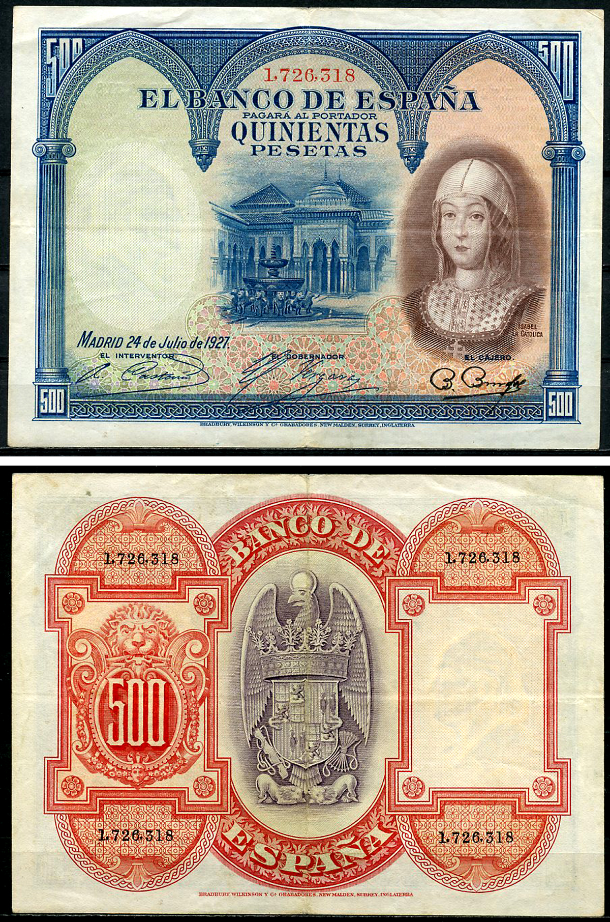 Испания 500 песет 1927 Изабелла I Кастильская, Львиный двор (Альгамбра) Pick 73 c бумага 451-1158-1