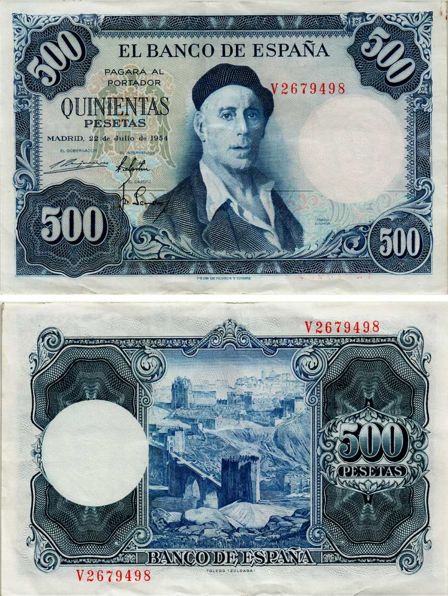 ИСПАНИЯ 500 ПЕСЕТ 1954 (1958) 22 ИЮЛЯ 1954, ИГНАСИО СУЛОАГА ИСПАНСКИЙ ХУДОЖНИК Pick 148а бумага 451-301-2