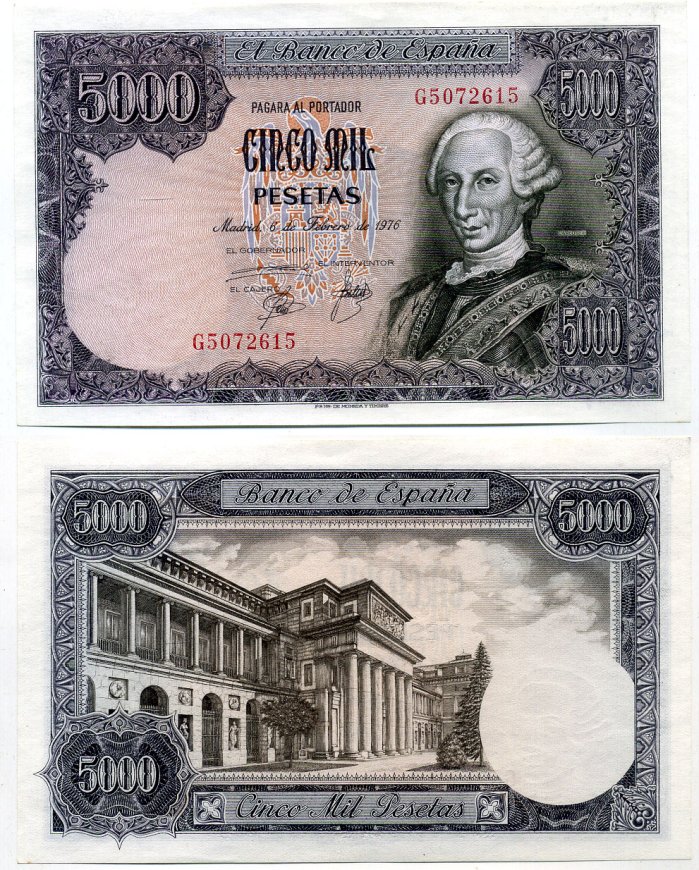 -Испания 5000 песет 1976 король Карлос III, здание центрального банка Pick 155 бумага UNC (пресс) 451-165-2Чехия и Словакия (Чехословакия)ЛюксембургМакедонияНидерланды (Голландия)НорвегияПольшаРумынияСловенияУкраинаФинляндияФранцияХорватияЛатвияШвецияШотландияЭстонияЮгославия, СербияИсландияШвейцарияБеларусьКипрПриднестровьеМальтаРеспублика Сербская (Босния и Герцеговина)Молдавия (Молдова)БельгияАвстрияАлбанияАнглияЛитваБолгарияБосния и ГерцеговинаВенгрияГерманияГрецияГрузияДанияДжерси, Гернси, Остров Мэн, ГибралтарПортугалияИталияДругие страны
