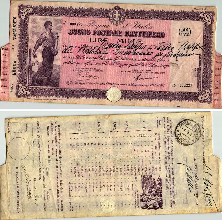 Италия Облигация Государственного 5% займа Итальянское королевство, Провинция Люкка (1924-1926), без отрывных купонов бумага 8607-98-1