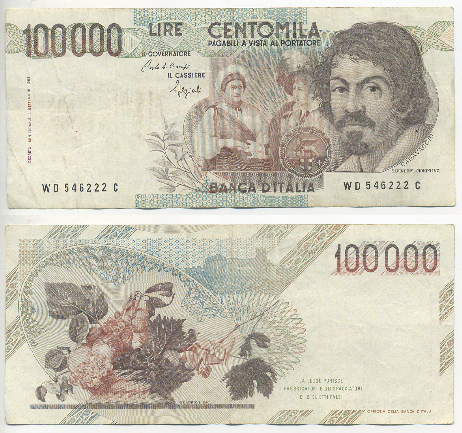 Италия 100000 лир 1983 Караваджо, фруктовый букет, подпись Speziali Pick 110b бумага 7220-10-3