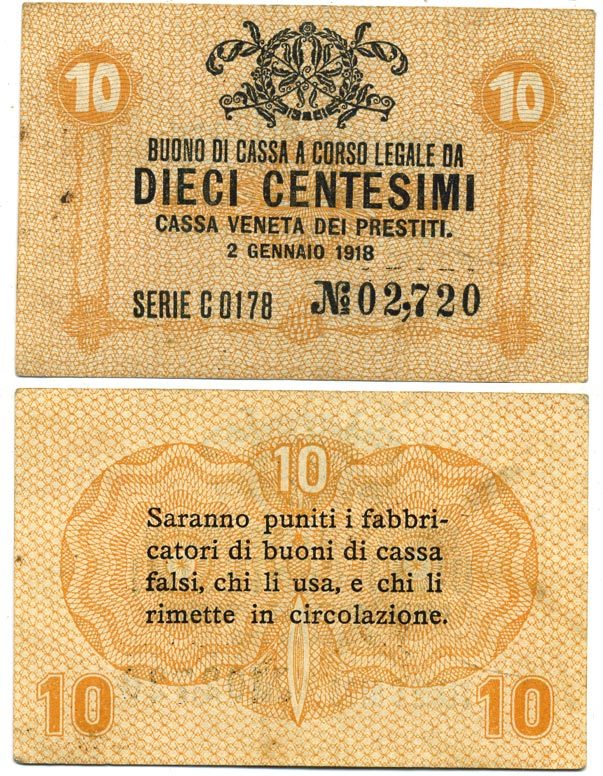 Италия 10 чентезимо 1918 военный выпуск Pick М2 бумага 3295-47-1-1