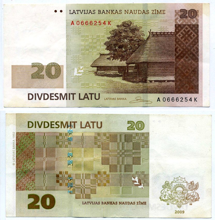 Латвия 20 латов 2009 Pick 55b, Сергеев 25 бумага 451-462-3