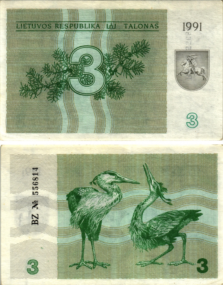 ЛИТВА 3 ТАЛОНА 1991 ПЕРВЫЙ ВЫПУСК, БЕЗ ТЕКСТА, СЕРЫЕ ЦАПЛИ Pick 33а, Сергеев 12 бумага аUNC 8613-53-1-1