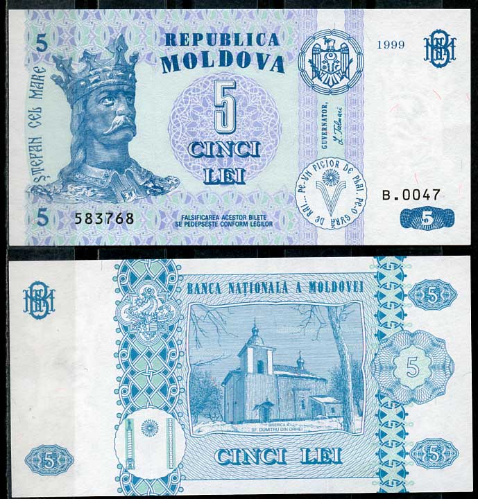 Молдавия 5 леев 1999 Стефан III Великий, Оргеев, Церковь Димитрия Солунского Pick 9 c бумага UNC (пресс) 450-8-2