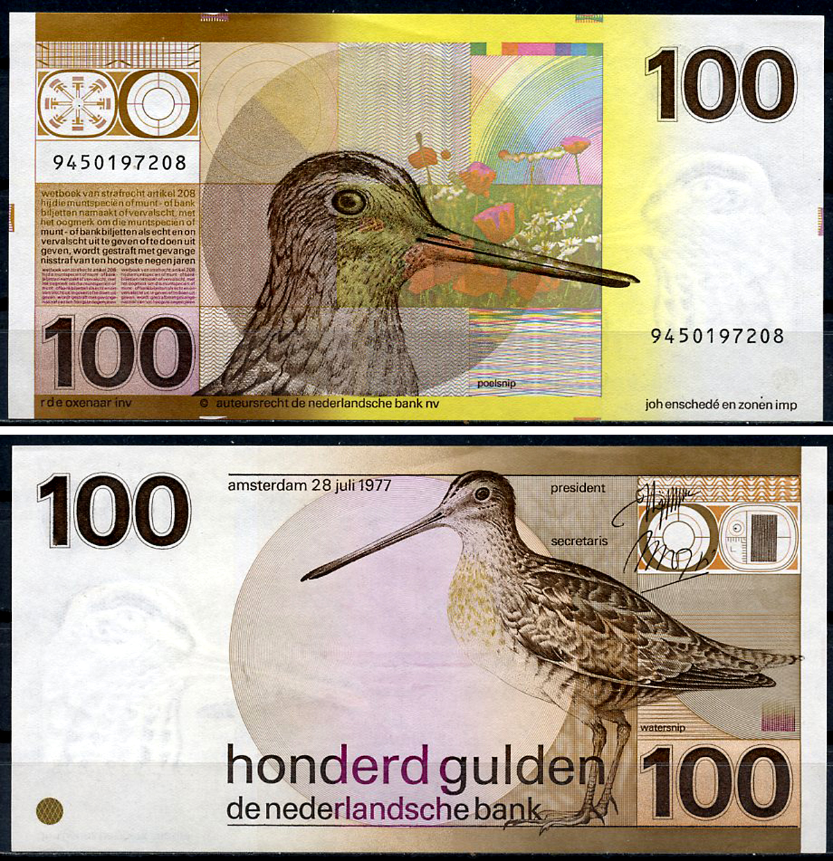 Нидерланды 100 гульденов 1977 бекас (Watersnip), большой бекас (Poelsnip) Pick 97 бумага UNC (пресс) 451-1198-1