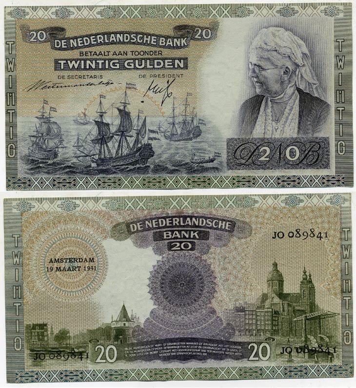 НИДЕРЛАНДЫ 20 ГУЛЬДЕНОВ 1941 АМСТЕРДАМ, 19 МАРТА 1941, КОРОЛЕВА ЭММА Pick 54 бумага aUNC 000-00-00