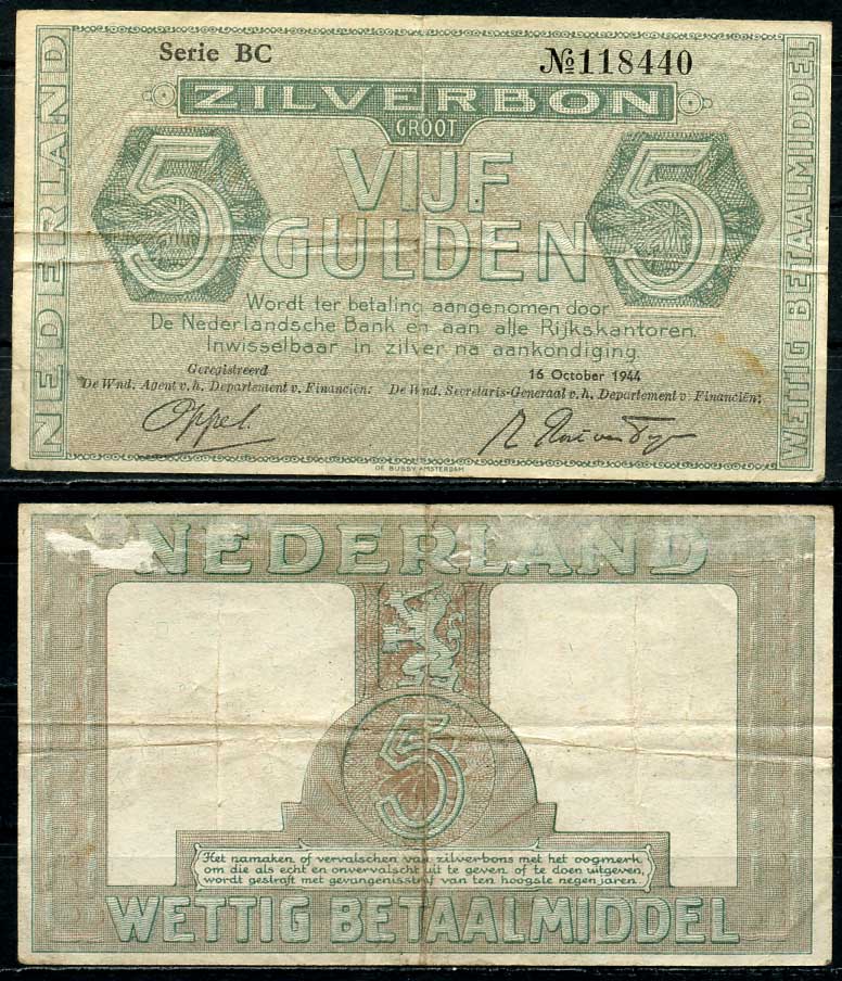 Нидерланды 5 гульденов 1944 серебряный ваучер, нет точки в №, в серии 2 буквы Pick 63 (1), Akkermans 17.1b.1 бумага 451-594-1