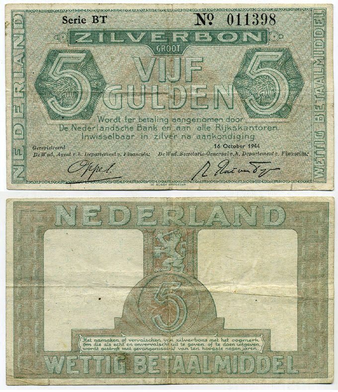 Нидерланды 5 гульденов 1944 серебряный ваучер, точка ниже о в № Pick 63 (2), Akkermans 17.1b.2 бумага 451-722-1