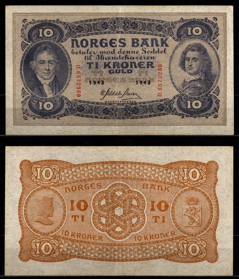 Норвегия 10 крон 1943 Вильгельм Фриман Корен Кристи (1-й председатель норвежского парламента) Pick 8 c бумага 451-1228-2