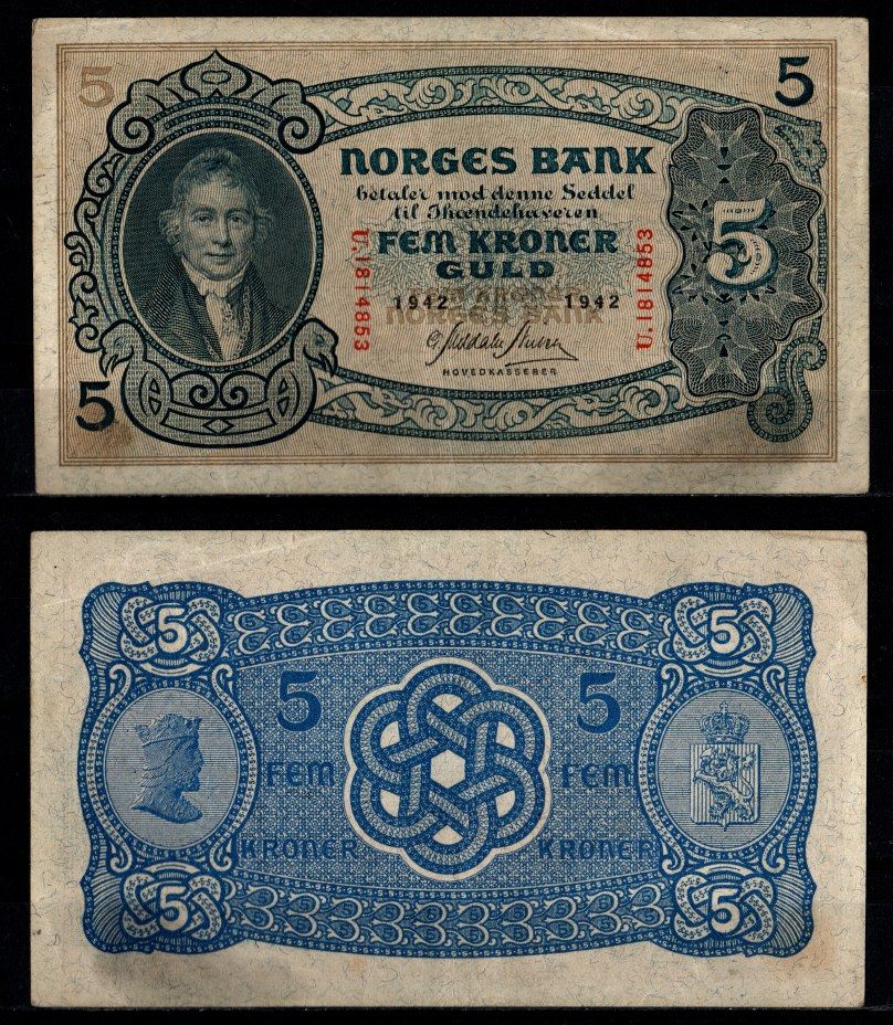 Норвегия 5 крон 1942 Вильгельм Фриман Корен Кристи (1-й председатель норвежского парламента) Pick 7 c бумага 451-1227-2