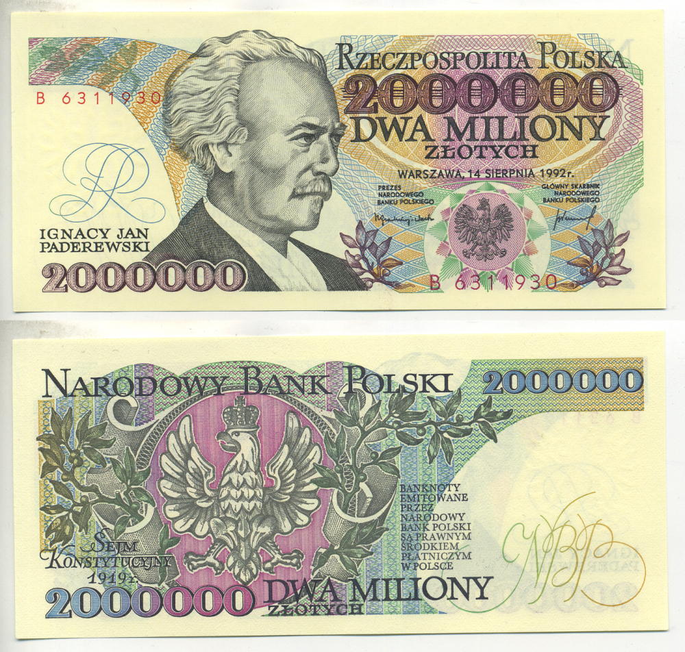 Польша 2000000 злотых 1992 серия В, Игнаций Ян Падеревский Pick 158b бумага UNC (пресс) 451-432-3