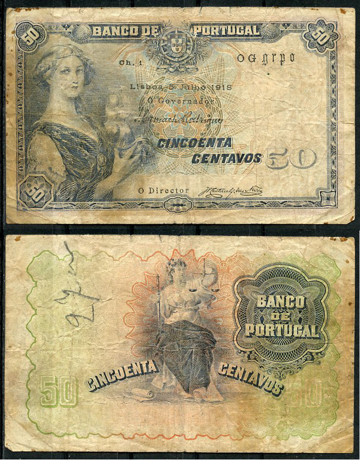 Португалия 50 сентаво 1918 5 июля 1918, женщина, богиня юстиции Pick 112а бумага 451-456-1