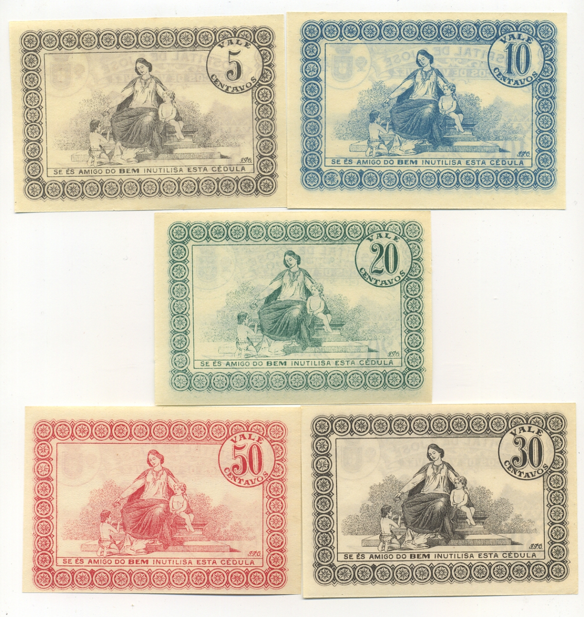 Португалия набор из 5 банкнот, 5, 10, 20, 30, 50 сентаво 1920 госпиталь Сан-Хосе, частный выпуск бумага UNC (пресс) 7555-10-1-2