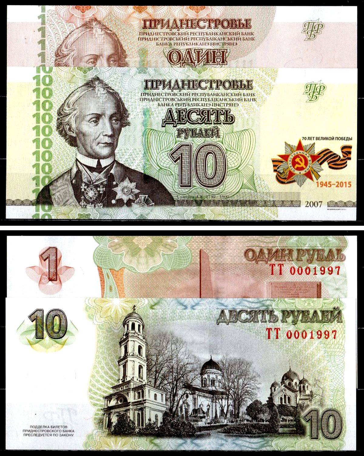Приднестровье набор из 2 банкнот (1 и 10 рублей) 2015 70 лет Победы во Второй мировой войне, Генералиссимус Александр Васильевич Суворов, серия ТТ 0001997 Pick 52 и 53 бумага UNC (пресс) 7548-38-4-2