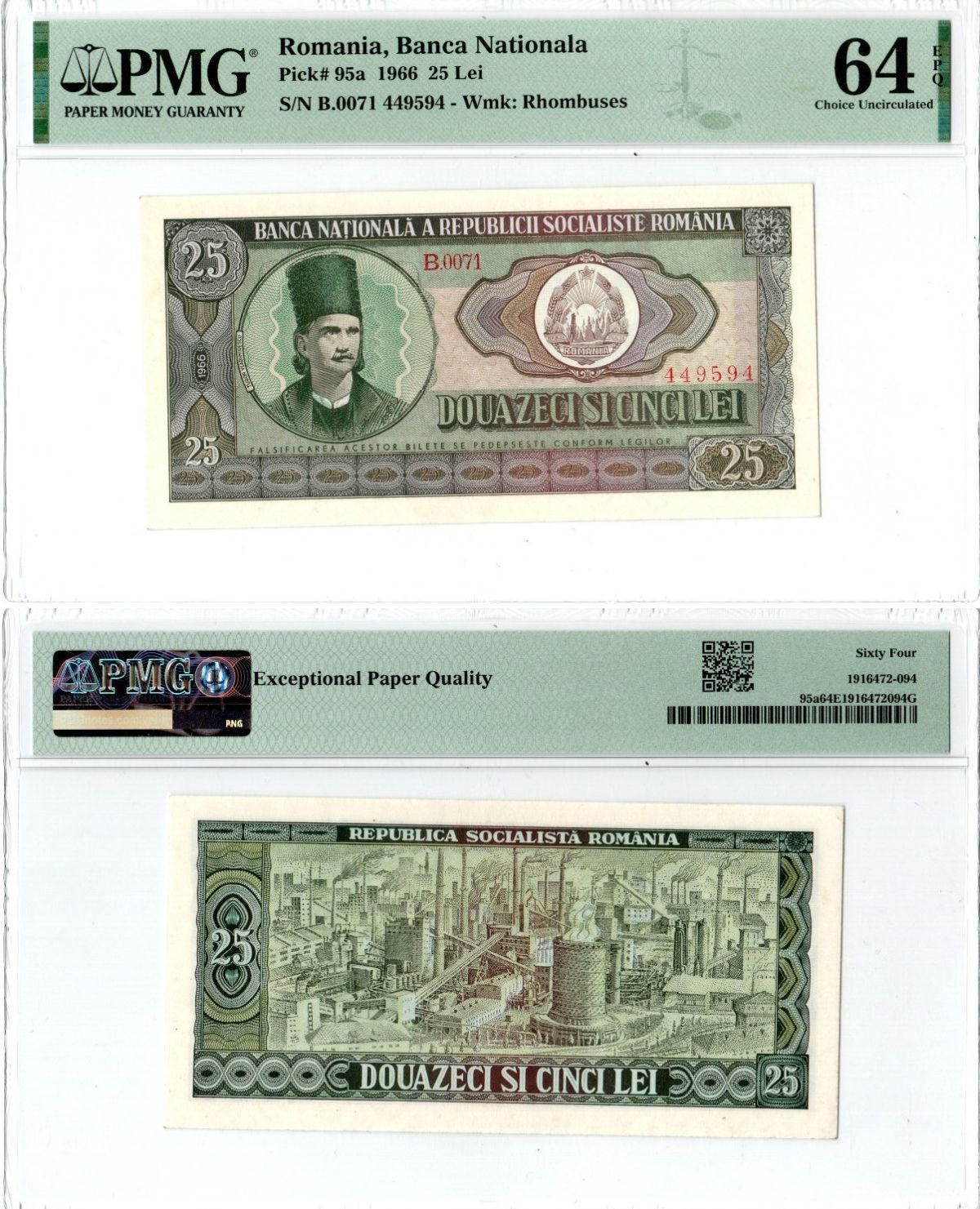 Румыния 25 лей 1966 Тудор Владимиреску. Нефтеперерабатывающий комплекс, Плоешти. В слабе PMG 64 choice uncirculated Pick 95 a бумага UNC (пресс) 452-1-82