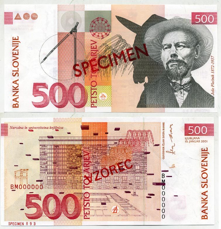 Словения 500 толаров 2001 Йоже Плечник, библиотека Национального университета, Любляна, SPECIMEN, образец Pick 16s бумага UNC (пресс) 451-369-1