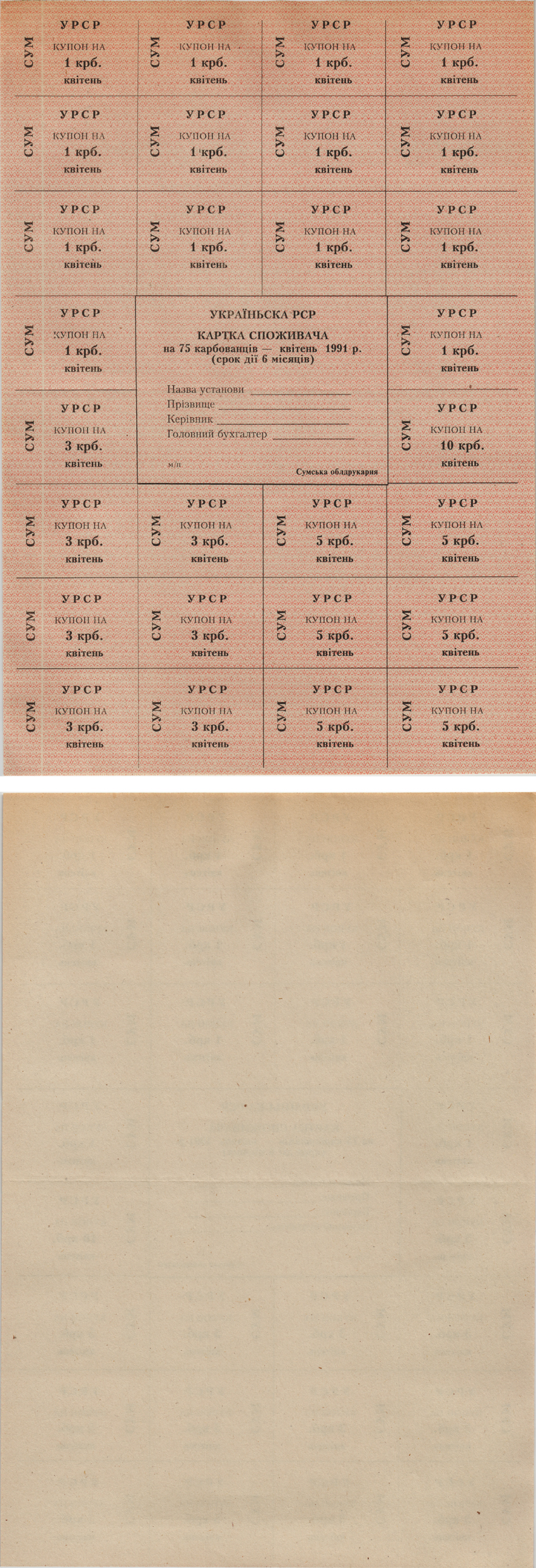 -----УКРАИНА КАРТОЧКА ПОКУПАТЕЛЯ НА 75 КАРБОВАНЦЕВ 1991 АПРЕЛЬ, КВIТЕНЬ Pick 70f бумага UNC (ПРЕСС) 8605-6-1